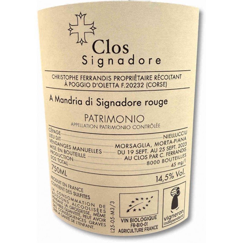 Ce vin rouge de Corse est issu des 4 parcelles du Clos Signadore, les premières parcelles acquises par Christophe FERRANDIS en 2001 quand il a fondé le domaine. Presque exclusivement plantées en cépage Nielluciu, quelques vieilles vignes de Vermentinu permettent d'élaborer la cuvée de patrimonio blanc.